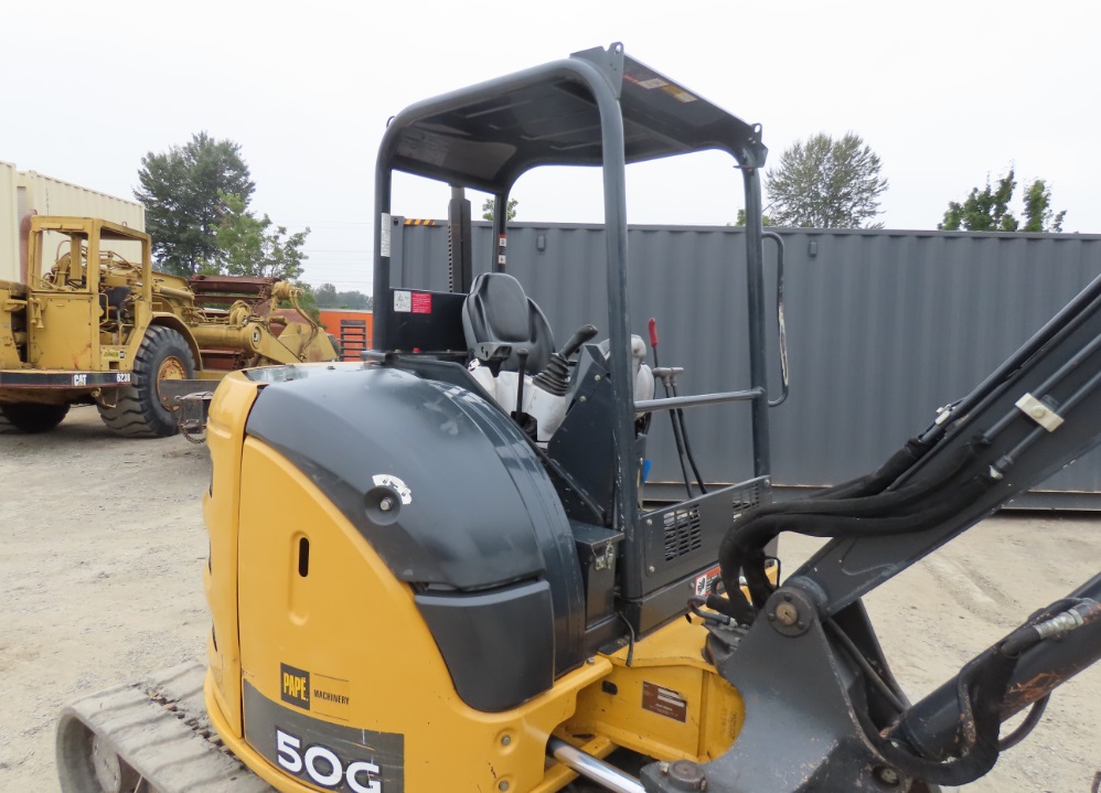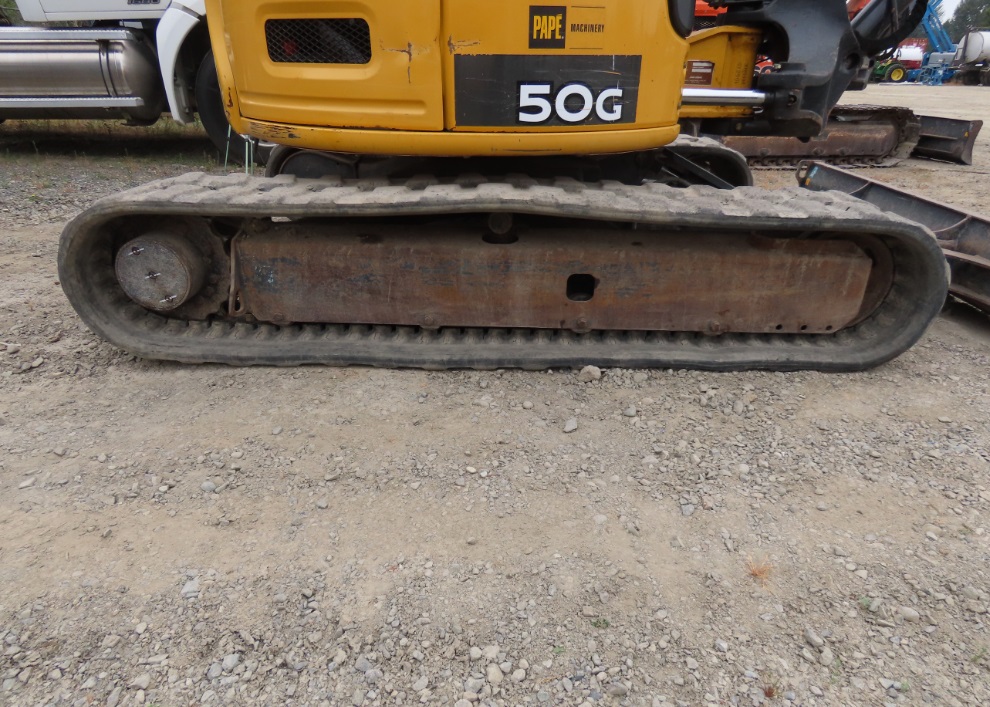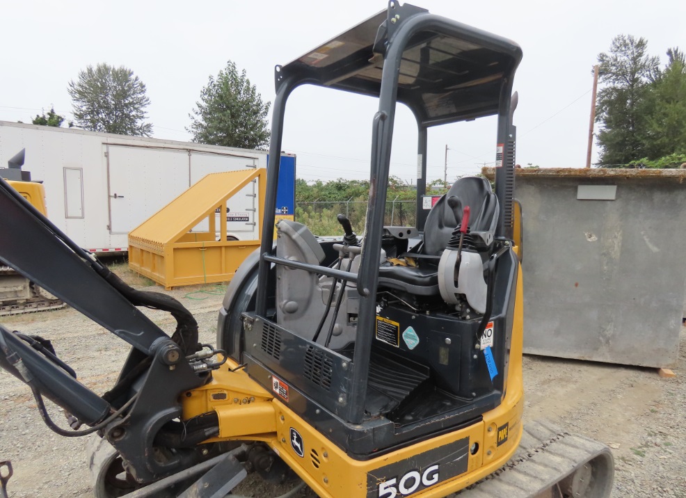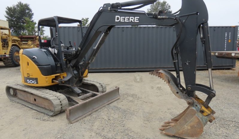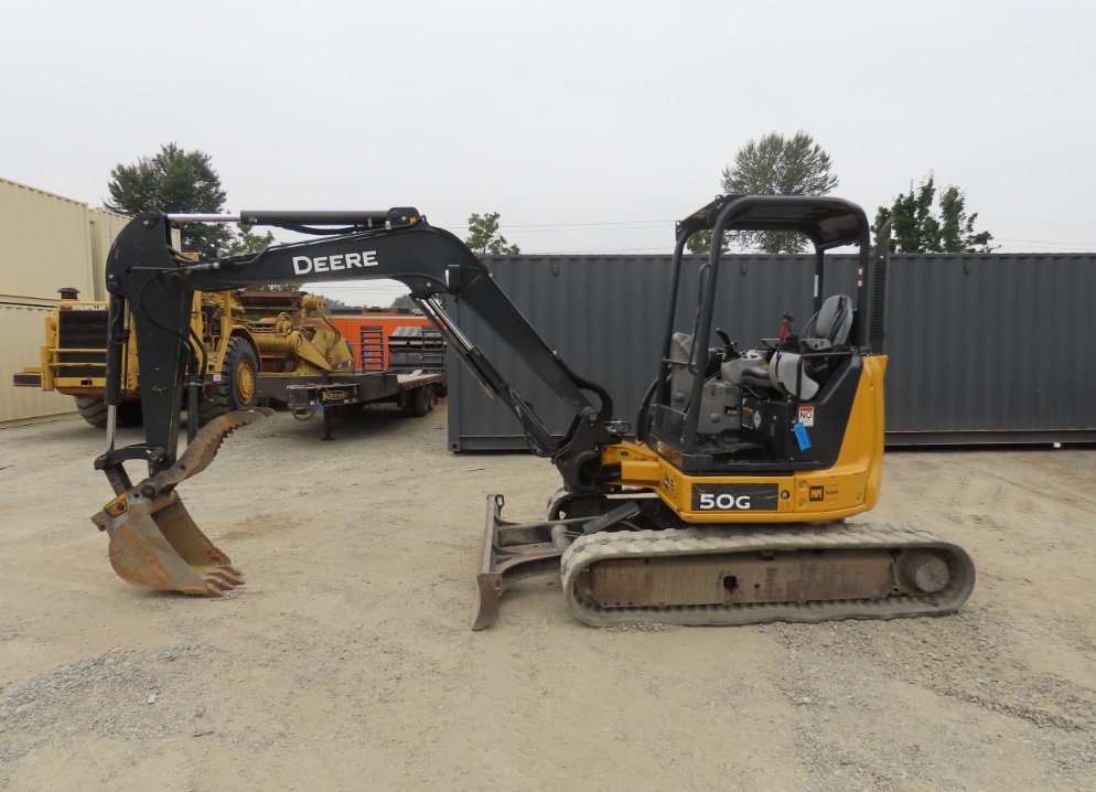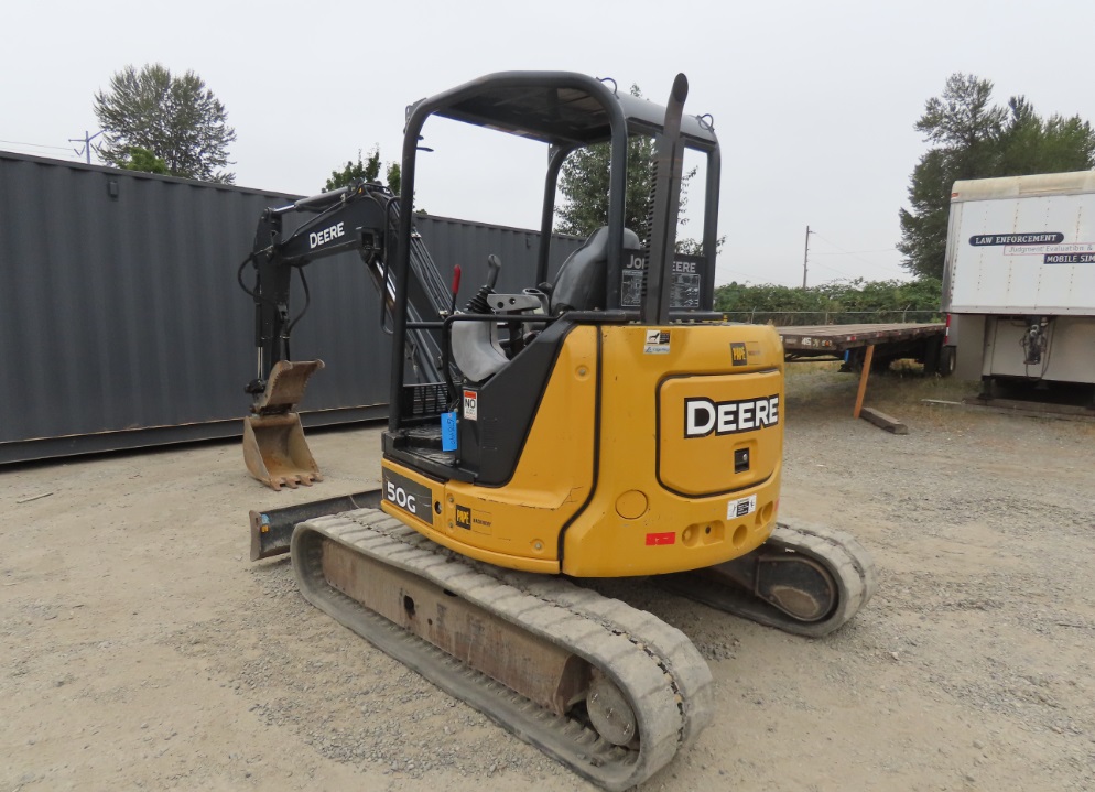 2016 John Deere 50G Hydraulic Mini Excavator Hyd Thumb Q/C Blade 2-Speed. Open ROPS, Hydraulic Thumb, 2-Speed Travel, Work Lights, Operator Horn, Manual Quick Coupler, Auto Idle, 79″ Backfill Blade