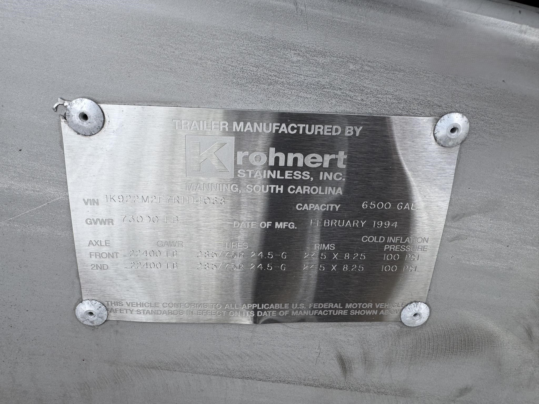 1994 Krohnert Stainless Steel Tanker – 6,500 gallon stainless steel tanker with stainless steel frame, deep drop, 3 inch center unload, pump platform, 3 top manholes, and outside aluminum wheels. Nice trailer for fertilizer/water/spray trailer. Can assist with delivery arrangements. We are required to collect sales tax on all vehicles/trailers sold to residents of: Ohio, Arizona, California, Florida, Indiana, Massachusetts, Michigan, South Carolina, and Washington unless you provide valid proof of sales tax exemption.